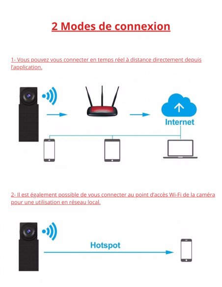 La caméra peut être connectée à un réseau Wi-Fi ou à un modem 4G. Elle peut également enregistrer sur carte mémoire sans connexion internet. Dans ce cas, vous pouvez régler les modes d’enregistrement et ajuster l’orientation de la caméra en vous connectant à son point d’accès Wi-Fi, ce qui vous permet aussi d’obtenir un retour vidéo en local tant que vous restez à proximité de l’appareil.