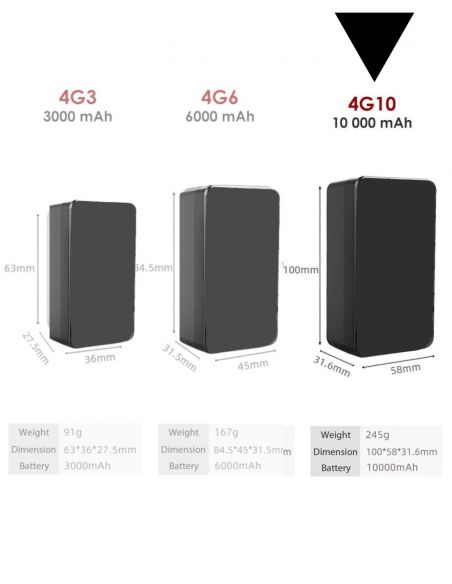 Ce traceur GPS bénéficie d'une batterie de 10000 mAh offrant une autonomie en veille de 100 jours et de 100 heures en fonctionnement.